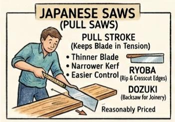 Japanese pull saws cut on the pull stroke rather than the push stroke, which allows for a much thinner blade and a narrower kerf. Many woodworkers — especially beginners — find them easier to control than Western-style saws, since the pull stroke naturally keeps the blade in tension.